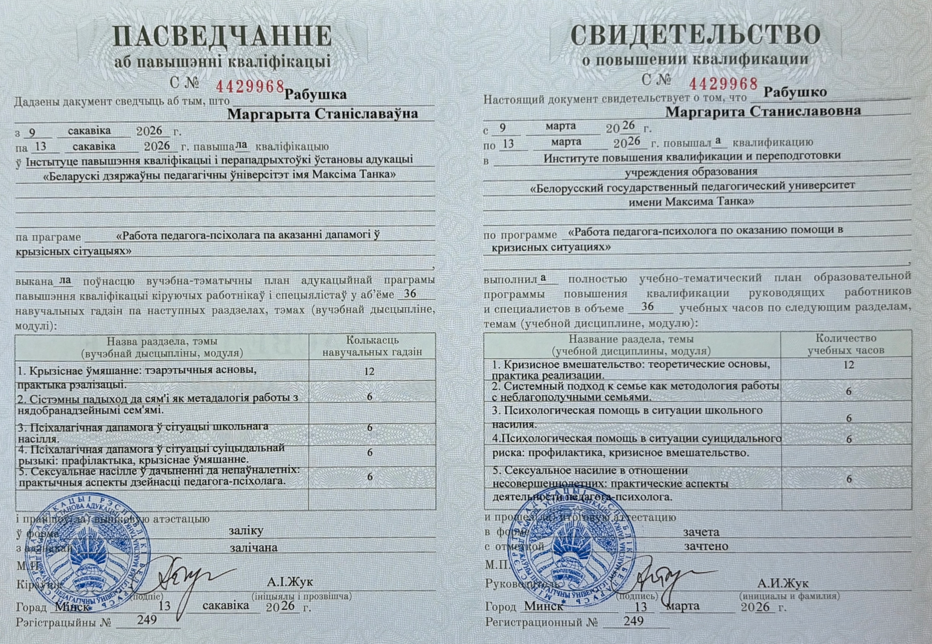 «Белорусский государственный педагогический университет имени Максима Танка» по программе «Работа педагога-психолога по оказанию помощи в кризисных ситуациях» (36 часов обучения).